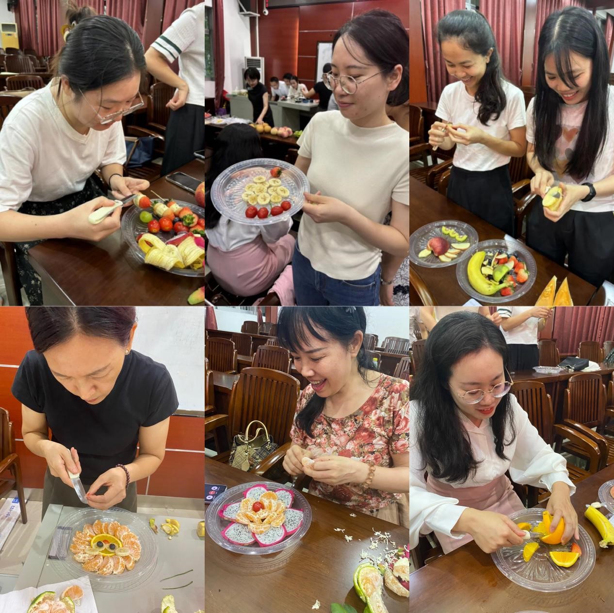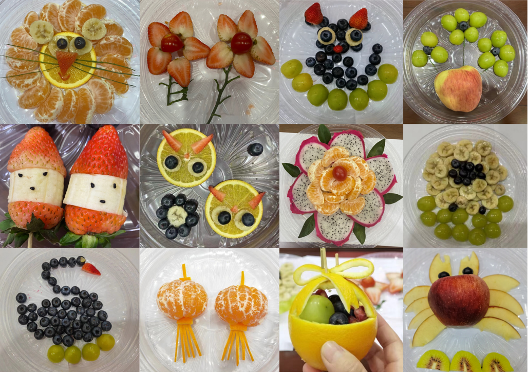 各位女职工不仅在各自的岗位上是行家里手,在创意拼盘方面也是能工巧匠,普通的水果经过她们的巧思巧手,变成了一个个灵动的图案和一幅幅生动的作品,一盘盘形态各异、妙趣横生、五彩缤纷的水果拼盘新鲜“出炉”。好看、好吃又好玩的活动还吸引了部分男老师的参与。