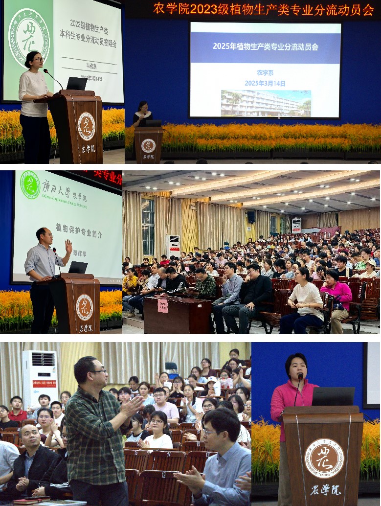 为深化专业教育改革,助力学生个性化发展,做好学院2023级植物生产类本科专业分流工作,我院于3月14日晚上在124教室召开2023级植物生产类本科生专业分流动员大会。会议由韦燕燕副院长主持,各系主任、副主任、学工组、教务办、植物生产类2023级班主任和全体2023级学生参会。