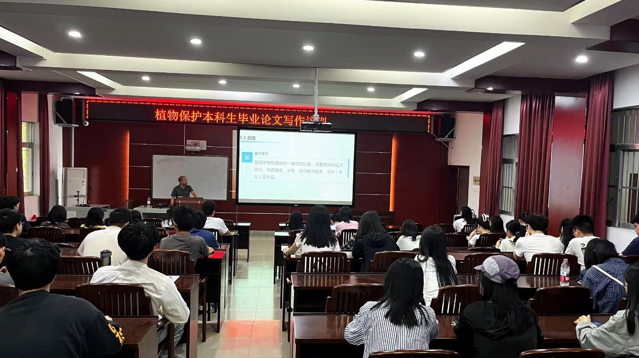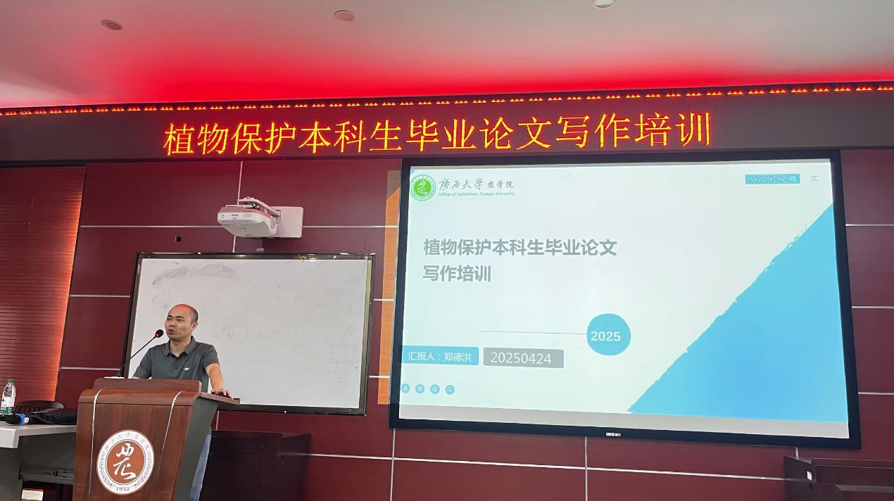 为进一步强化我院本科毕业设计(论文)环节的教学质量,确保2025届本科生能够高质量地完成毕业设计(论文),根据学校、学院工作安排,我院植物保护系于2025年4月24日在学院306多媒体教室开展了“植物保护本科生毕业论文写作培训”。主讲老师郑德洪副教授就本科毕业论文的题目、中英文摘要、前言、材料与方法、结果与分析、讨论与总结等各部分开展了详细的写作指导,并通过实例分析了毕业论文写作的规范和注意事项。最后,郑德洪老师以“数据不说谎、学术即修行、批判中成长”总结了如何写好本科毕业论文,并殷切希望同学们进入冲刺状态,认真打磨好毕业论文。