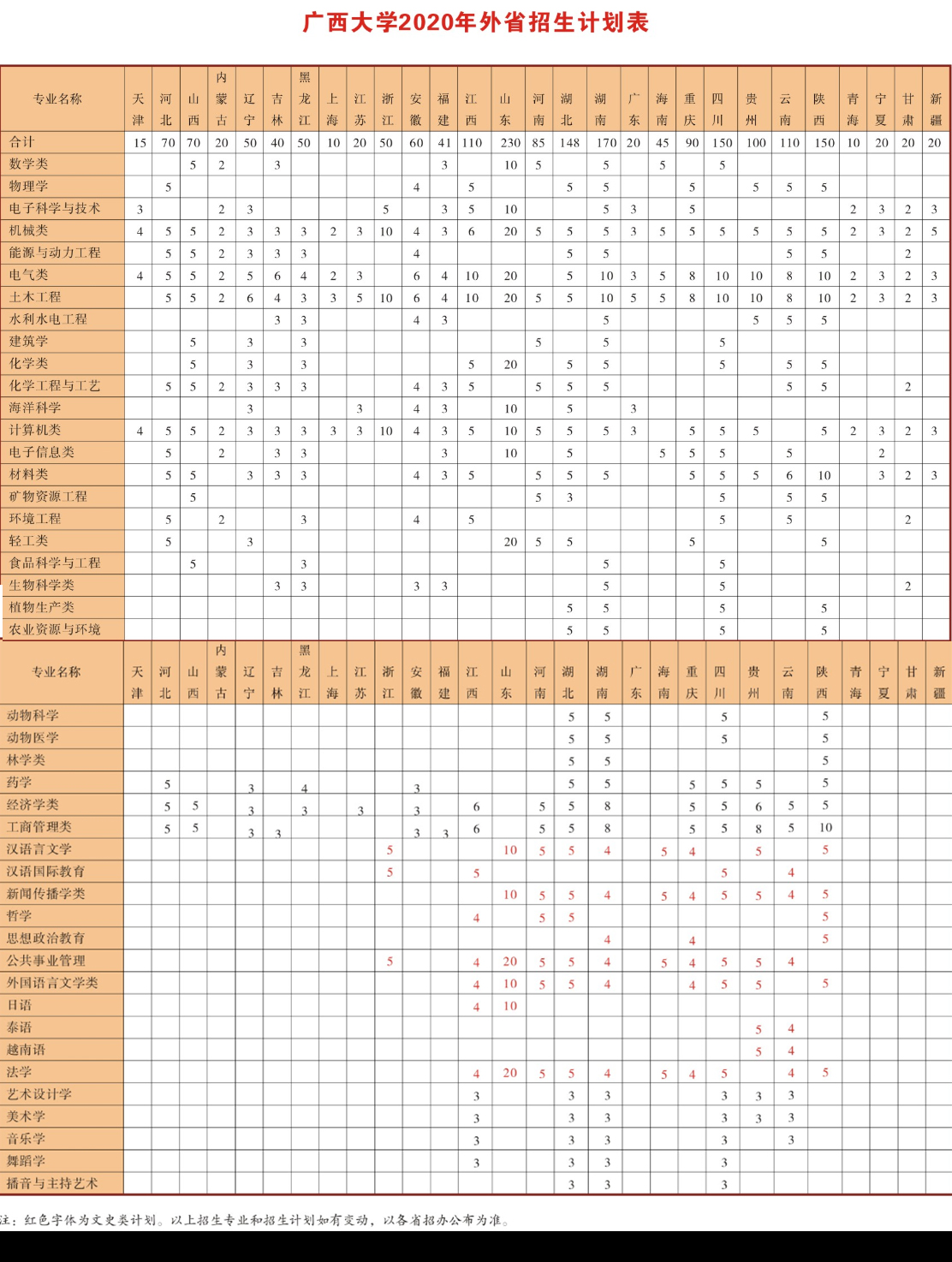 广西大学2020年外省招生计划表