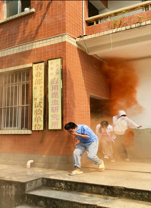 随后,保卫处相关同志组织师生在昆虫所展开火灾应急疏散演练。随着一阵急促的警报声在校园内响起,参加演练的同学迅速从昆虫研究所楼内沿着楼梯、扶着墙、弯着腰、捂着口鼻,安全、快速、有序地往下疏散到安全区域。待师生全部安全完成撤离后,各位师生按照校保卫处的预定方案到晒谷场对起火目标进行灭火,在实践中掌握灭火器的使用方法。