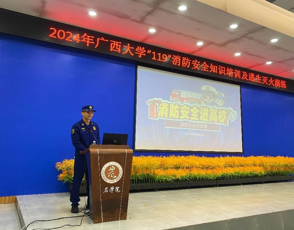 为响应全国119消防安全日号召,进一步提升我校师生的消防安全意识和自救互救能力,11月19日下午,广西大学保卫处联合西乡塘消防救援大队北湖中队在beats365亚洲版开展消防安全知识培训及逃生灭火演练,校内各单位的四百多名代表参加此次活动。