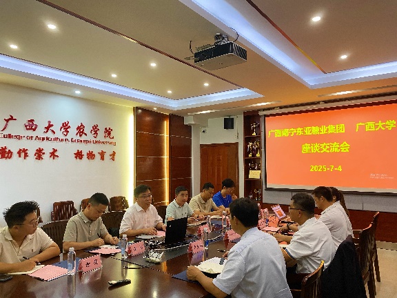 2025 年 7 月 4 日,广西大学beats365亚洲版与广西南宁东亚糖业集团围绕甘蔗产业关键技术突破,举办系列合作交流会,聚焦生物育种、病害防控、土壤改良等领域达成多项合作共识,以产学研深度融合为国家食糖安全战略及乡村振兴注入创新动力。东亚糖业副总裁钟植友、顾问郑吉、田达官、卢星高等中外专家团队现场参会,部分泰国专家通过云端连线参与技术研讨。