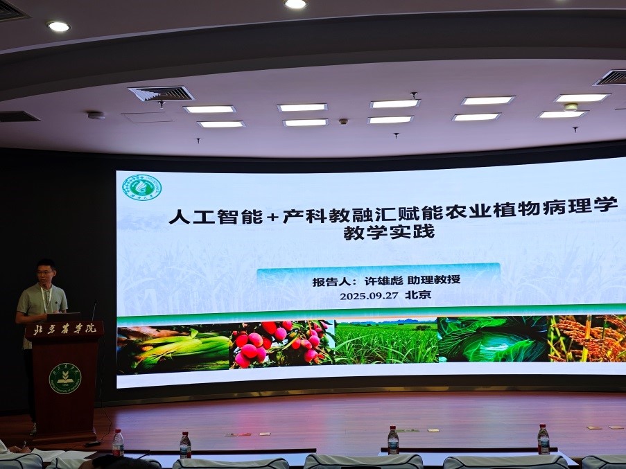 本次研讨会以“创新融合与发展,赋能新农科人才培养”为主题,聚焦植物病理学教学理念革新与教学方式升级等关键议题。会上我院许雄彪老师以“人工智能+产科教融汇赋能农业植物病理学教学实践”为题作专题报告,系统介绍了我院近年来在农业植物病理学课程改革方面的探索举措与实践成效,获得与会专家的广泛关注和高度评价。