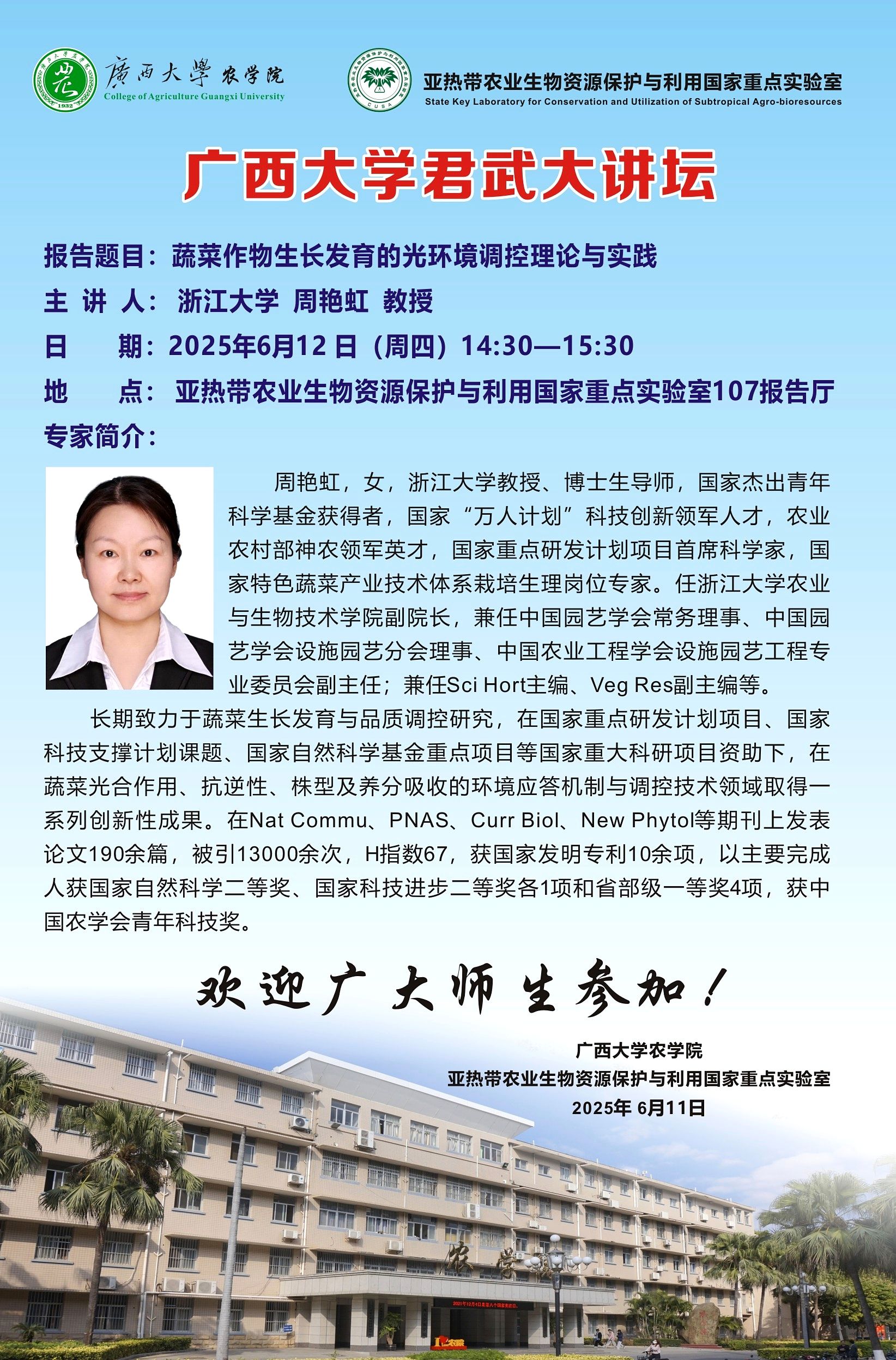 广西大学君武大讲坛-蔬菜作物生长发育的光环境调控理论与实践主讲人:浙江大学周艳虹教授
