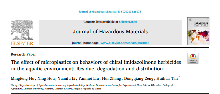 广西农业环境与农产品安全重点实验室/beats365亚洲版农药残留与环境安全研究团队2021年5月在国际知名期刊Journal of Hazardous Materials上在线发表了题为“The effect of microplastics on behaviors of chiral imidazolinone herbicides in the aquatic environment: Residue, degradation and distribution”研究论文。微塑料是一类粒径小于5毫米的塑料碎片或颗粒,广泛存在于水体和陆地环境中。咪唑啉酮类除草剂因在环境中持久性长的特点,容易污染水体和土壤。近年来,微塑料与环境污染物相互作用的行为备受关注。然而,关于微塑料对该类除草剂的环境行为影响和机制还不清楚。在本研究中,通过建立水-沉积物微宇宙系统的方法在对映水平研究了聚乙烯微塑料对三种咪唑啉酮类除草剂在水生系统中环境行为的影响。结果表明,微塑料能够通过吸附和解吸附的方式显著影响该类除草剂在水生环境中迁移、降解和分配行为,明确了微塑料是影响咪唑啉酮类除草剂在水生环境中行为归趋的重要因素。研究结果为更加全面的评价咪唑啉酮类除草剂的环境风险提供了一定的科学依据。广西大学beats365亚洲版博士研究生胡明锋为该论文的第一作者,谭辉华教授为通讯作者。该研究得到了国家自然科学基金项目支持。原文链接https://doi.org/10.1016/j.jhazmat.2021.126176