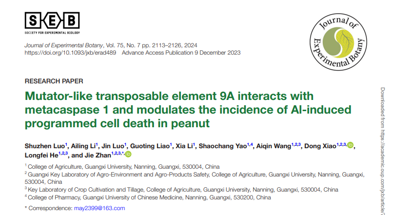 作物学博士研究生罗淑贞为第一作者在《Journal of Experimental Botany》发表研究成果——Mutator-like transposable element 9A interacts with metacaspase 1 and modulates the incidence of Al-induced programmed cell death in peanut。发现一种核蛋白,突变体样转座因子9A(AhMULE9A),在体外和体内直接与AhMC1相互作用,促进铝诱导细胞程序性死亡。詹洁副研究员为通讯作者。