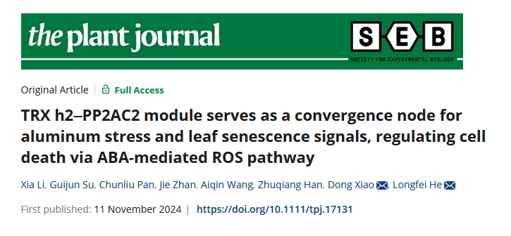近日,我院作物学博士研究生李霞为第一作者在《Plant Journal》发表了研究成果——TRX h2–PP2AC2 module serves as a convergence node for aluminum stress and leaf senescence signals, regulating cell death via ABA-mediated ROS pathway。发现TRX h2与PP2AC2均能显著增强铝敏感性和叶片衰老,PP2AC2可增强TRX h2的稳定性,TRX h2和PP2AC2形成复合体,促进ABA和ROS积累的复合物,有效调节铝胁迫和衰老下的细胞死亡。肖冬副教授和何龙飞教授为通讯作者。