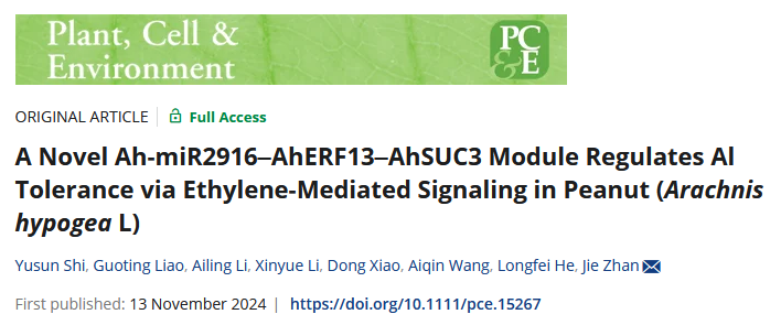作物学博士研究生施煜荪为第一作者在《Plant, Cell & Environment》发表了研究成果——A Novel Ah‐miR2916–AhERF13–AhSUC3 Module Regulates Al Tolerance via Ethylene‐Mediated Signaling in Peanut (Arachnis hypogea L)。发现一种新的Ah-miR2916(miR2916)-AhERF13-AhSUC3模块通过乙烯介导的花生信号参与铝胁迫反应。詹洁副研究员为通讯作者。