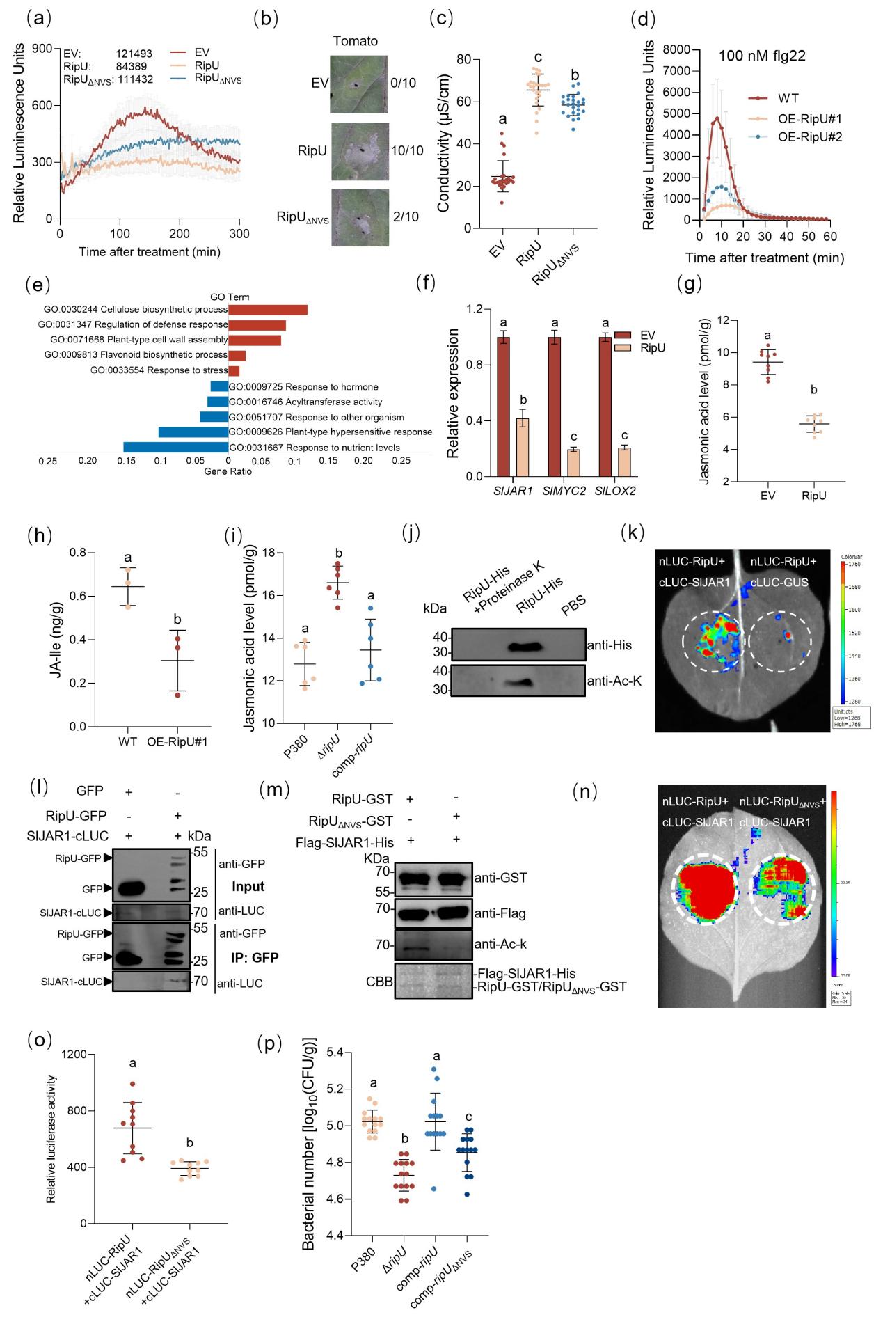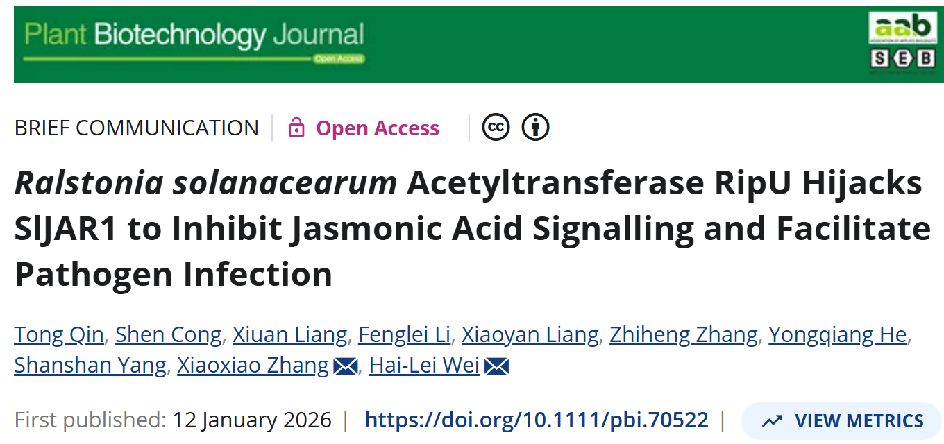 近日,广西大学张晓晓课题组与中国农业科学院农业资源与农业区划研究所魏海雷研究员团队合作,在国际知名期刊《Plant Biotechnology Journal》在线发表题为“Ralstonia solanacearum acetyltransferase RipU hijacks SlJAR1 to inhibit jasmonic acid signaling and facilitate pathogen infection”的研究论文。该研究以国内流行的茄科雷尔氏菌(Ralstonia solanacearum)中III型效应蛋白RipU为研究对象,系统揭示了其通过劫持番茄茉莉酸信号通路中的关键酶SlJAR1,抑制茉莉酸积累、进而促进病原菌侵染的分子机制。
