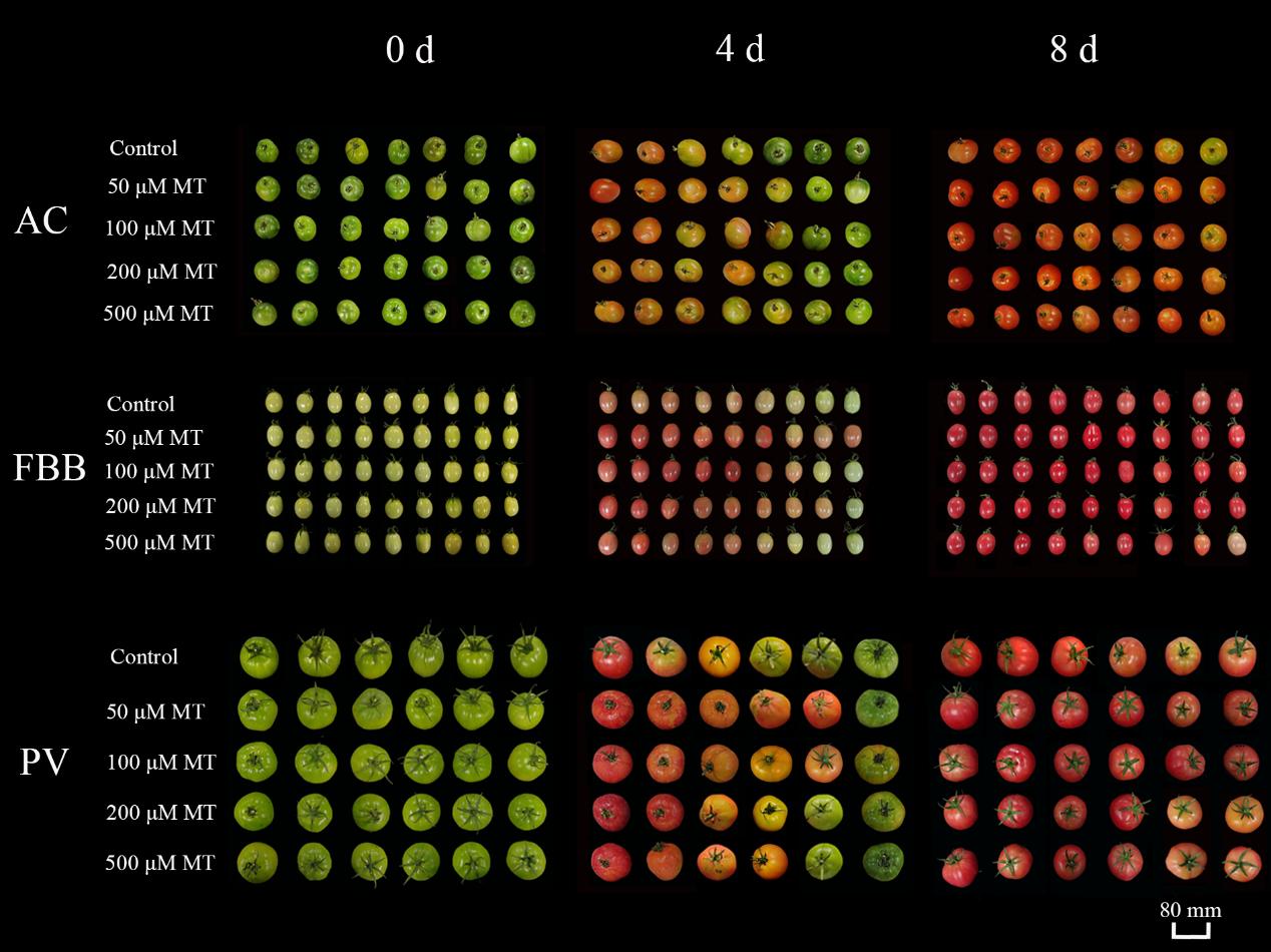 图1. 不同浓度的褪黑素促进了采后AC、FBB和PV番茄果实的着色。
