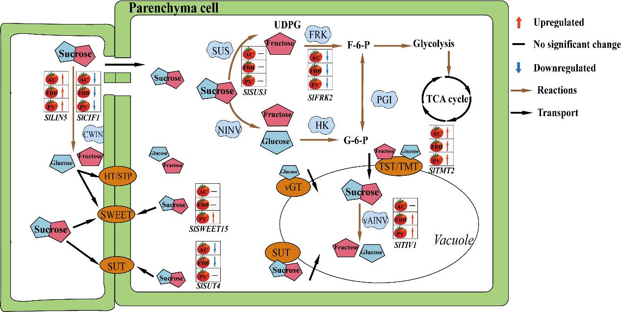 . 褪黑素参与番茄果实采后糖代谢与转运的调控。CWINV,细胞壁转化酶;HT/STP,己糖/糖转运蛋白;SWEET,糖最终输出转运蛋白;SUT,蔗糖转运蛋白;vGT,液泡葡萄糖转运蛋白;TST/TMT,质膜糖/单糖转运蛋白;vAINV,液泡酸性转化酶;NINV,中性转化酶;SUS,蔗糖合成酶;FRK,果糖激酶;HK,己糖激酶。