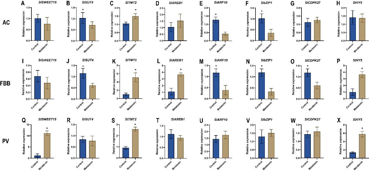 图7. 褪黑素对收获后 AC、FBB和PV番茄果实中与糖运输相关的基因以及与糖代谢相关的转录因子基因的影响。A-C为AC番茄中的糖运输相关基因;D-H为AC番茄中的糖代谢相关转录因子基因;I-K为FBB番茄中的糖运输相关基因;L-P为FBB番茄中的糖代谢相关转录因子基因;Q-S为PV番茄中的糖运输相关基因;T-X为PV番茄中的糖代谢相关转录因子基因。