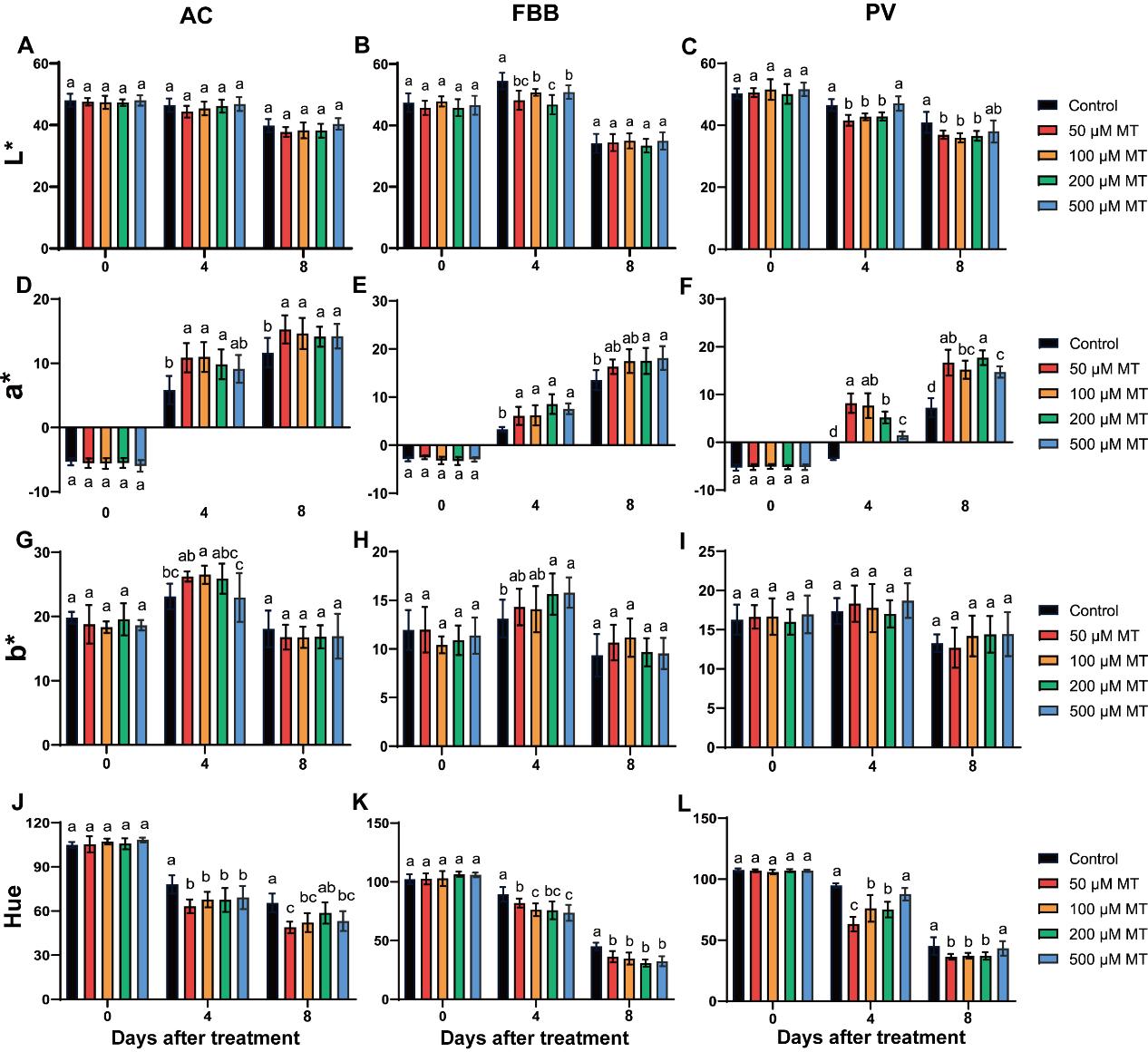 图2. 不同浓度褪黑素对采后AC、FBB和PV番茄果实L*、a*、b*值及色相的调控作用。A-C分别为AC、FBB和PV番茄果实的L*值;D-F分别为AC、FBB和PV番茄果实的a*值;G-I分别为AC、FBB和PV番茄果实的b*值;J-L分别为AC、FBB和PV番茄果实的色相值。数据表示为平均值±标准差。不同小写字母表示处理间存在显著差异(P<0.05)。