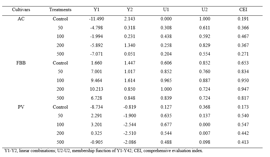 表1. 不同浓度褪黑素处理后AC、FBB和PV番茄果实的综合品质指标