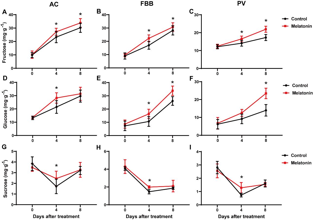 图5. 褪黑素对采后AC、FBB和PV番茄果实中蔗糖、果糖和葡萄糖含量的影响。A、B、C分别显示AC、FBB和PV番茄果实中果糖含量的变化;D、E、F分别显示AC、FBB和PV番茄果实中葡萄糖含量的变化;G、H、I分别显示AC、FBB和PV番茄果实中蔗糖含量的变化。数据为平均值±标准差。标记“*”表示处理间存在显著差异,P<0.05。