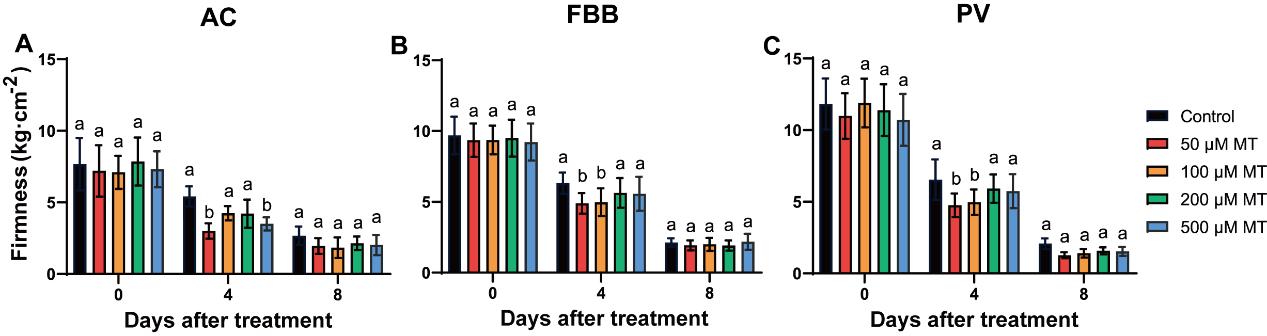 图4. 不同浓度的褪黑素降低了采后AC、FBB和PV番茄果实的硬度。A,AC番茄果实硬度变化;B,FBB番茄果实硬度变化;C,PV番茄果实硬度变化。数据为平均值±标准差。不同小写字母表示处理间存在显著差异(P<0.05)。