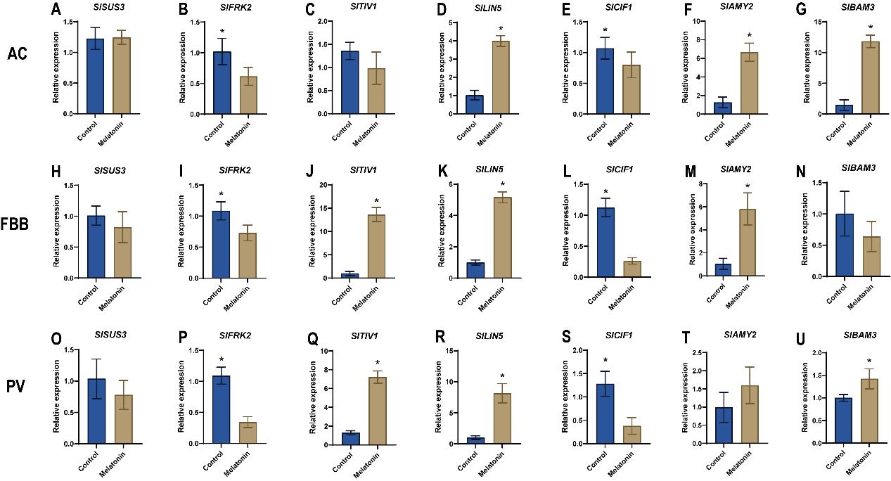 图6. 褪黑素对采后AC、FBB和PV番茄果实中糖代谢基因的影响。