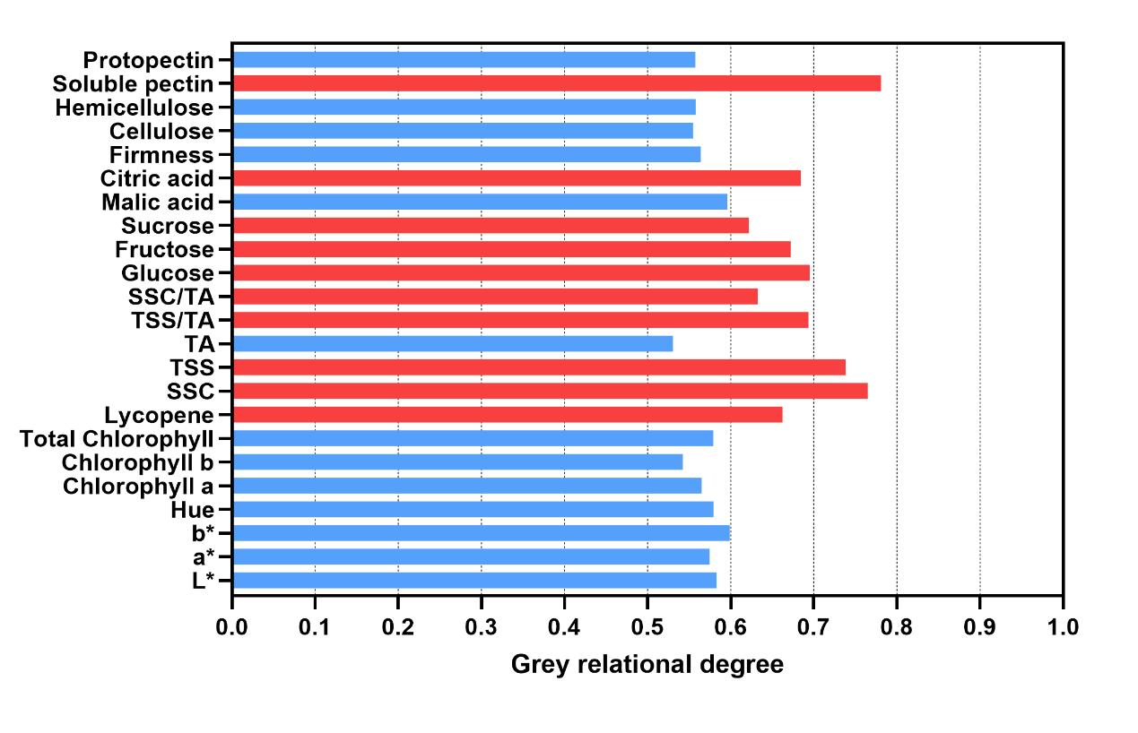 图8. 番茄果实中CEI与质量指标间的灰色关联度。Chl a,叶绿素a;Chl b,叶绿素b;Total Chl,总叶绿素;Lyco,番茄红素;SSC,可溶性固形物含量;TSS,总可溶性糖;TA,可滴定酸度;Glu,葡萄糖;Fru,果糖;Suc,蔗糖;Cel,纤维素;Hem,半纤维素;SP,可溶性果胶;PP,原果胶;MA,苹果酸;CA,柠檬酸。红色标注指标为GRA排名中位列前十的指标。