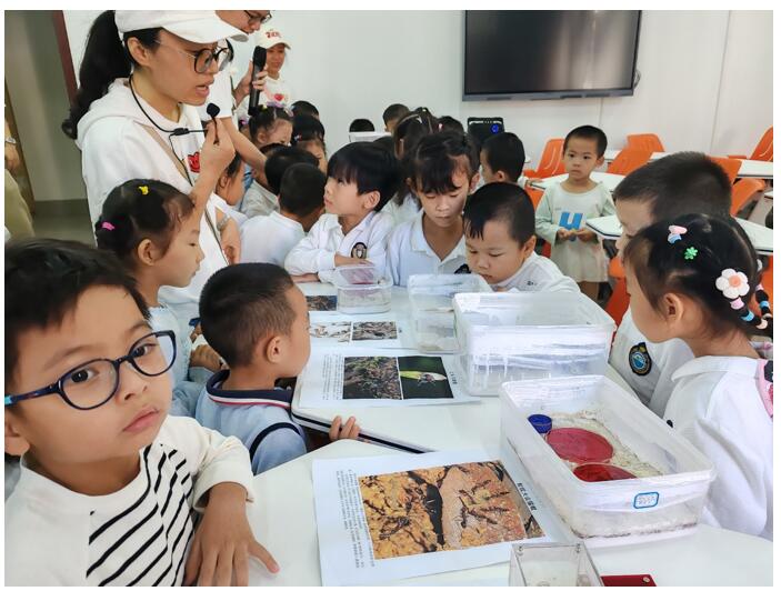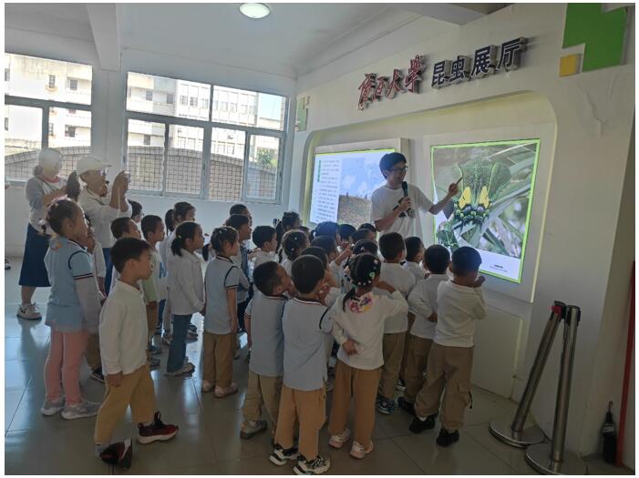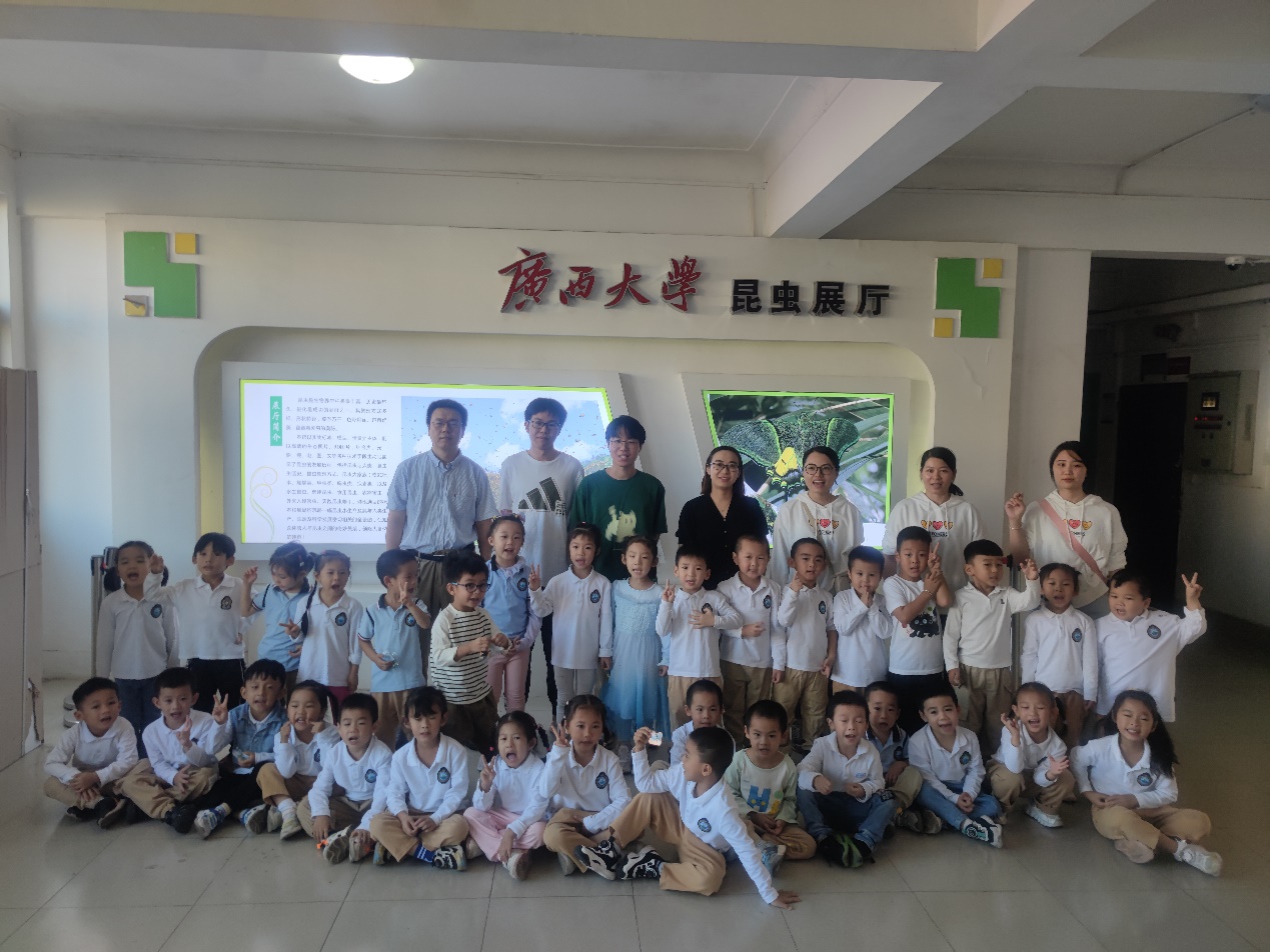文/图 高琼华 2024年10月31日,广西大学第二幼儿园中(1)班的36名小朋友在老师的带领下,兴致勃勃地参观了植物科学实验中心的昆虫展厅。中心李俊老师、植保系高琼华老师以及研究生叶咏昊、孙金波等同学热情地为师生们提供了详细的讲解。在老师的悉心引导下,小朋友们聚精会神地学习了昆虫的特征,包括昆虫的足、翅的对数等知识。孩子们还观赏了色彩斑斓的蝴蝶和甲虫,以及研究生们精心饲养的蚂蚁、甲虫等活体昆虫,体验了昆虫世界的奇妙。此次科普活动受到了参观师生的一致好评,大家纷纷表示收获颇丰。