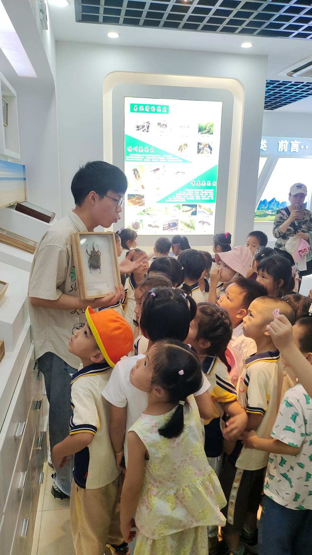 小朋友们观察昆虫标本并听研究生志愿者讲解