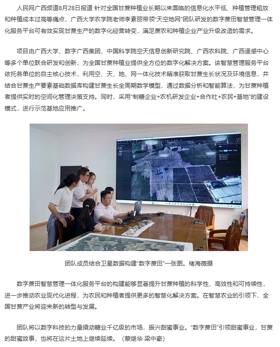 参加本次互联网加活动,展示了李素丽老师带领“天空地网”团队开发研究出的数字蔗田智慧管理一体化服务平台。给甘蔗数字化平台发展拓展了机会,可有效解决目前甘蔗生产向数字化经营转变的瓶颈问题,以满足蔗农和种植企业的需求。