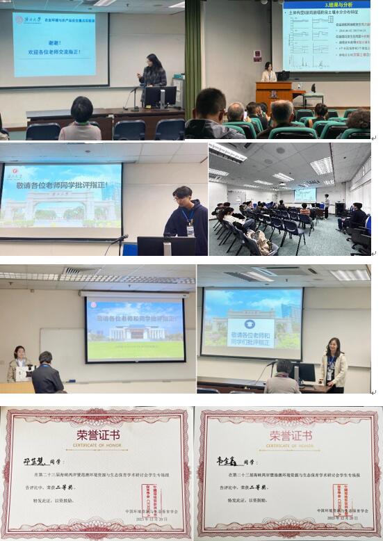 由段晓倩老师指导的邓芷慧、韦全鑫、韩杰欣、王旌靡四名研究生均在会上作报告,阐释了花岗岩崩岗侵蚀坡面土体构型特征、崩岗分布区域特征、喀斯特关键带多界面产流水利用潜力等问题。其中邓芷慧和韦全鑫同学荣获优秀学术报告。